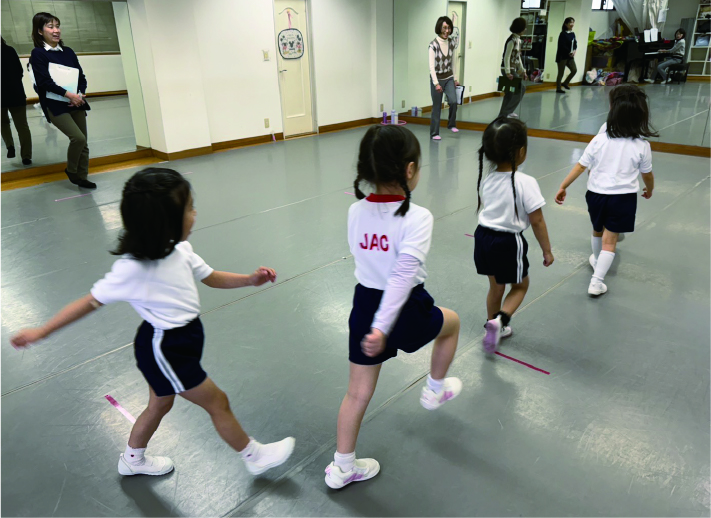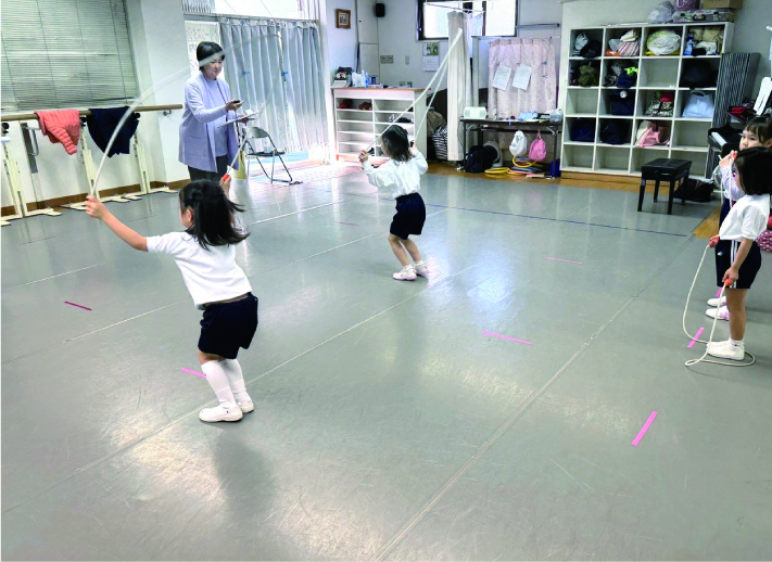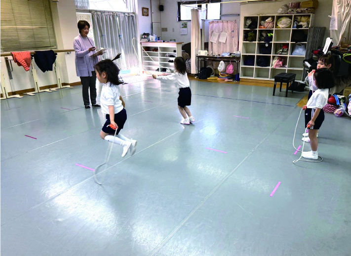 着替え、挨拶、テスト時のお行儀(待つ態度など)、音楽に合わせて歩く、スキップ、ケンパーなど